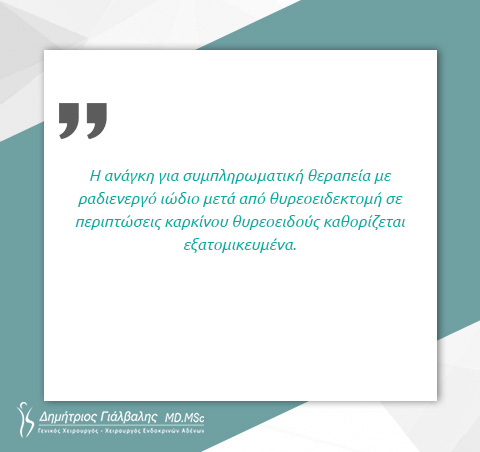 Η ανάγκη για συμπληρωματική θεραπεία με ραδιενεργό ιώδιο μετά από θυρεοειδεκτομή σε περιπτώσεις καρκίνου θυρεοειδούς καθορίζεται εξατομικευμένα.